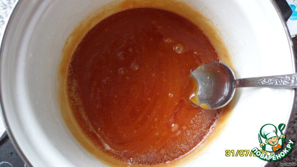 После этого снять с огня и вмешать сливочное масло (оно сначала запенится, а затем вся масса станет похожа на густую карамель)