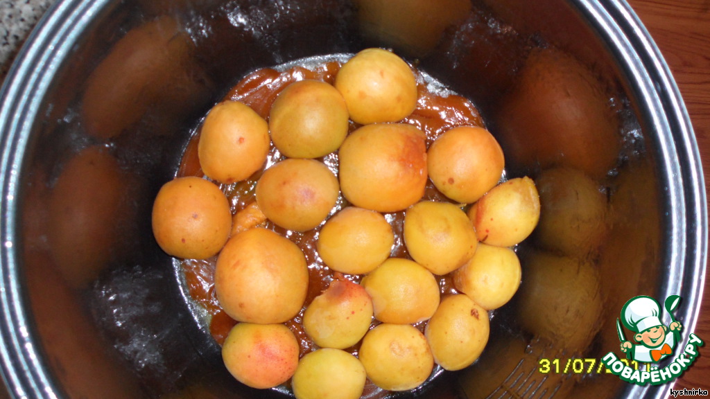 Вылить карамель в хорошо смазанную маслом мультиварку. Половинки абрикосов выложить поверх карамели срезом вниз и как можно плотнее друг к другу.