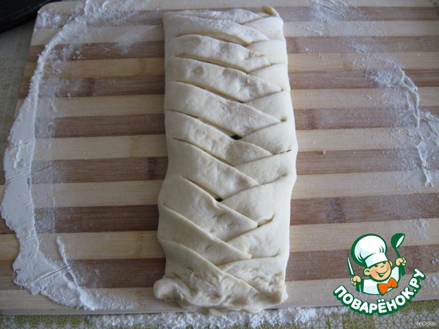 Уложить полосы теста внахлест, чередовать их, как при плетении косы. Конец завернуть и прижать.