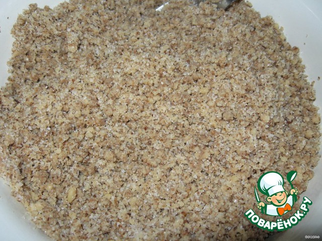 Пока тесто "бродит" приготовить начинку. Перемолоть в мясорубке или блендере грецкие орехи. Добавить сахар и растопленное сливочное масло, хорошо перемешать.