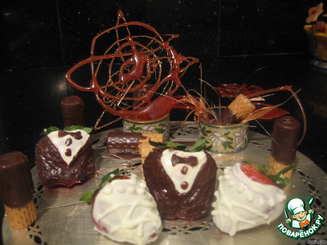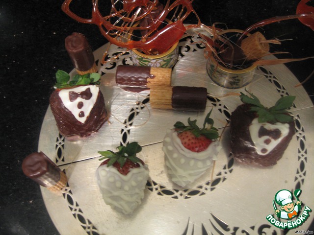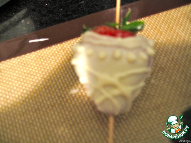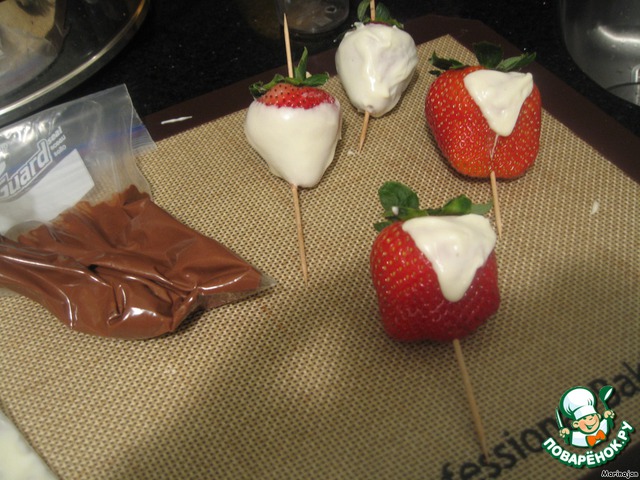 Окунуть 2 клубнички полностью,а на двух треугольники кисточкой.