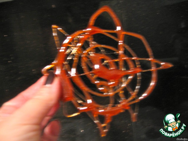 Из подостывшей карамели вытягиваем ложкой нити.Они очень хорошо смотрятся на тортах.