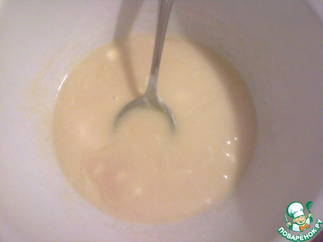 В миске № 2 растапливаем масло с медом, немного остужаем, добавляем сметану, коньяк и яйца. Вместо коньяка можно использовать любой ароматный ликер.