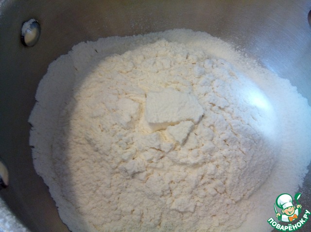 Муку просеять (я всегда это делаю в кастрюльку или глубокую чашу, так как потом удобнее замешивать тесто в ёмкости), добавить разрыхлитель и перемешать.