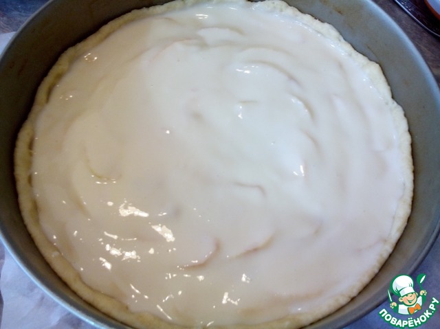 Заливаем сметанным кремом (крем должен покрыть всю поверхность).