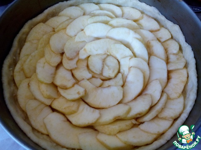 Яблоки выкладываем на тесто в один слой по кругу немного в нахлест, начиная от края.