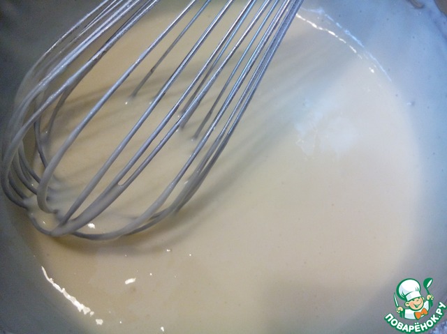 Итак, приготовим начинку. Яйцо, сметану и сахар тщательно взбить до однородности, затем добавить муку и снова хорошо взбить.