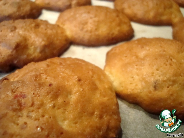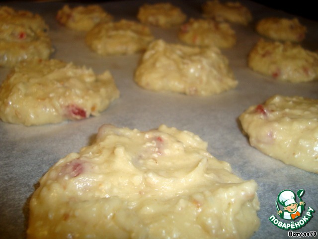 Выстилаем противень бумагой для выпечки. Ложкой выкладываем печенье на бумагу. Отправляем в разогретую до 200 гр. духовку на 15 минут.