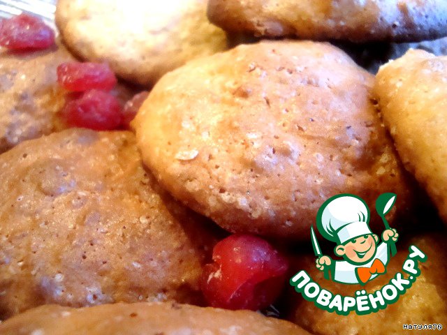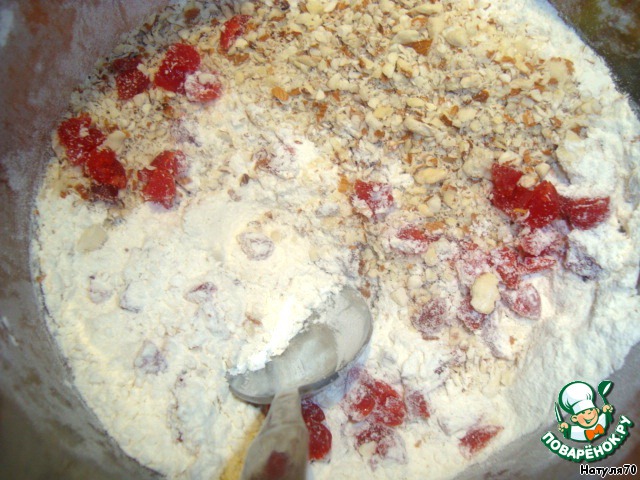 В муку добавить овсяные хлопья, орехи, вишню, разрыхлитель и ванилин. Перемешать.