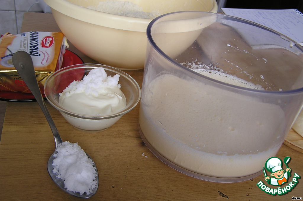 Добавить сметану в яичную массу, перемешать. Ввести полученную массу в мучную крошку. Тщательно перемешать, тесто получится мягким, но добавлять муку не нужно. Оставить охлаждаться в холодильнике не меньше, чем на два часа. А лучше, на ночь.