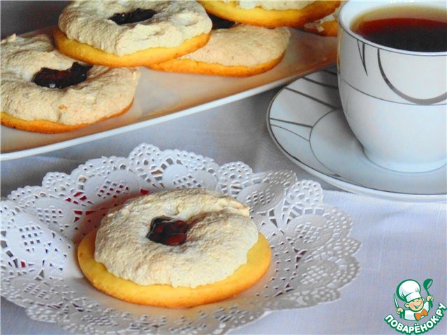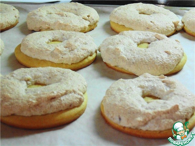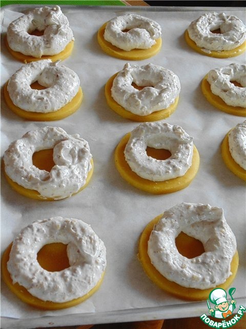 Духовку разогреть до 180*С. Охлажденное тесто раскатать толщиной 5мм, формой для печенья вырезать круг d 5-8 см. Выложить на противень, застеленный пекарской бумагой. На основу пирожного нанести белковую массу, лучше шприцем.