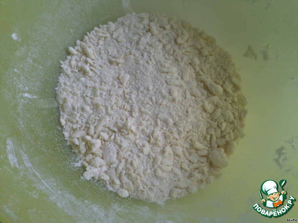 В просеянную муку добавьте маргарин кусочками и сахарный песок.Перемешайте.