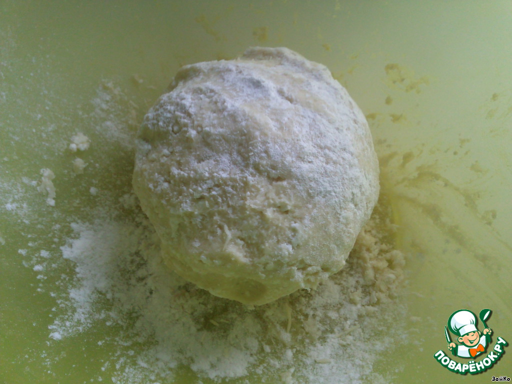 Добавьте творог и сметану.Замесите тесто,скатайте в шар,уберите в холодильник на час.
