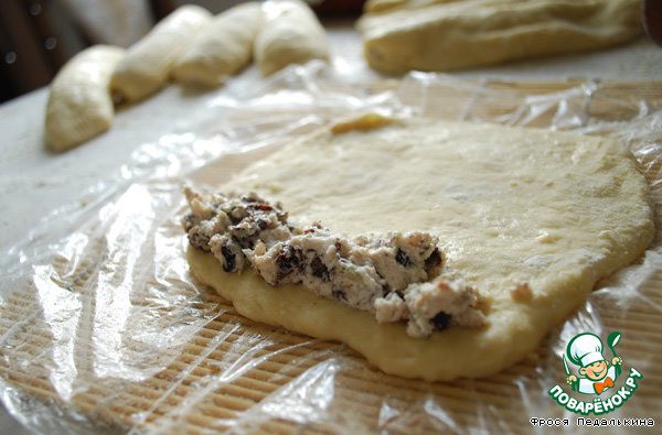 Каждую часть раскатать прямоугольником размером 10*15 см. На край положить начинку и свернуть рулетиком. Опять выручил японский коврик для роллов.
