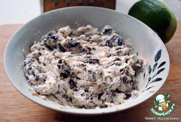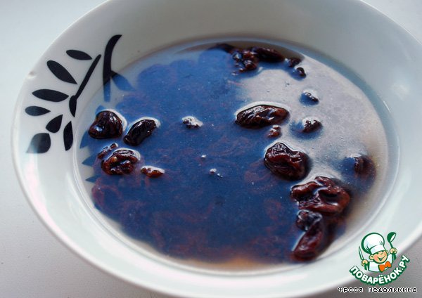 Для начинки: замочить изюм в кипятке на 5-7 минут, мелко порезать.