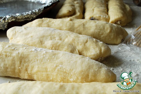 Для теста: Муку просеять, добавить разрыхлитель и дрожжи, перемешать. Смешать молоко, сахар и масло, добавить муку, соль и 1 яйцо, замесить тесто.