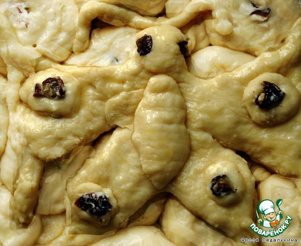 И оставшегося теста вырезаем бабочку, делаем глаза из изюма.