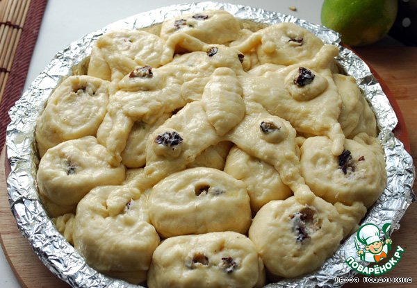 Делаем брюшко, украшаем крылья изюмом. Остатками теста заполняем зазоры между цветами. Смазываем пирог взбитым яйцом, оставляем на расстойку еще на 15 минут. Сверху пирог можно посыпать сахаром и корицей.