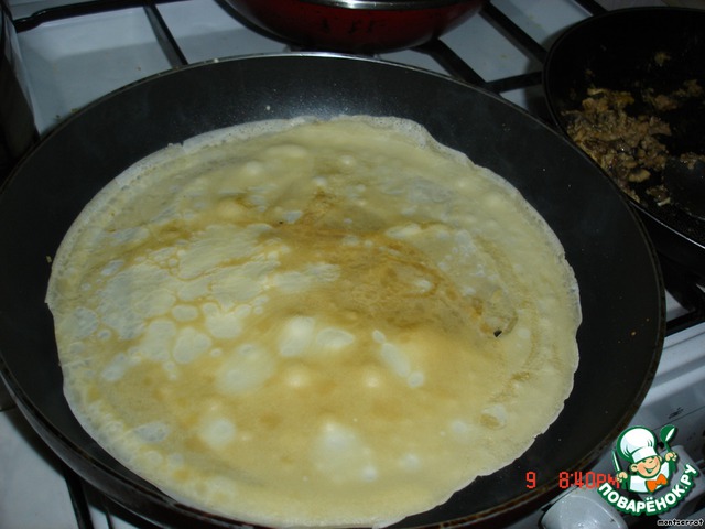 Выпекаем блинчики: на разогретую сковороду наливаем тесто очень тонким слоем, непрерывно поворачивая. Тесто должно понемногу запекаться, через 3-4 минуты перевернуть и запечь с другой стороны.