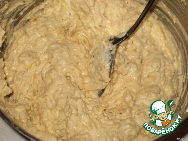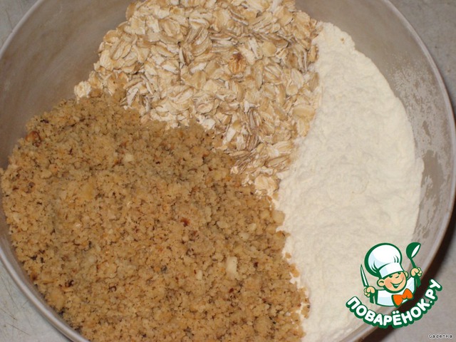 Молотый фундук, овсянку и муку с разрыхлителем смешать в сухую смесь.