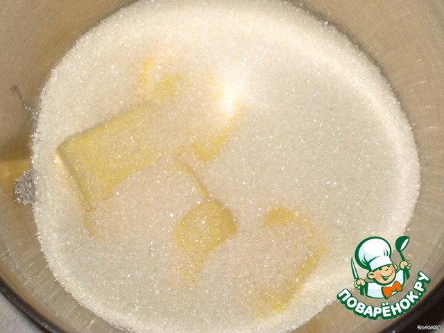 Размягченный маргарин взбить в сахаром в легкий крем.