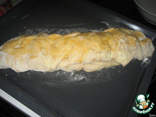 Выложить рулет на противень швом вниз. Взбить молоко с желтком и смазать сверху рулет. Поставить в духовку на 35 минут при температуре 220.