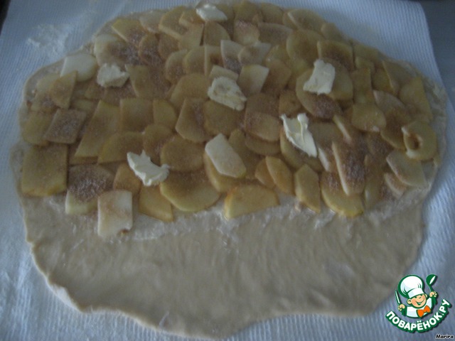 Тесто намазать сливочным маслом и посыпать панировочными сухарями, оставив с края полоску шириной 10 см. Ровным слоем выложить яблоки, смешать корицу с сахаром и посыпать яблоки. На яблоки положить несколько кусочков сливочного масла. С помощью полотенца скатать рулет .
