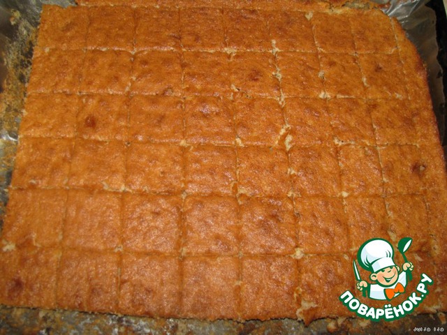Остывший корж, нарезать небольшими квадратиками.