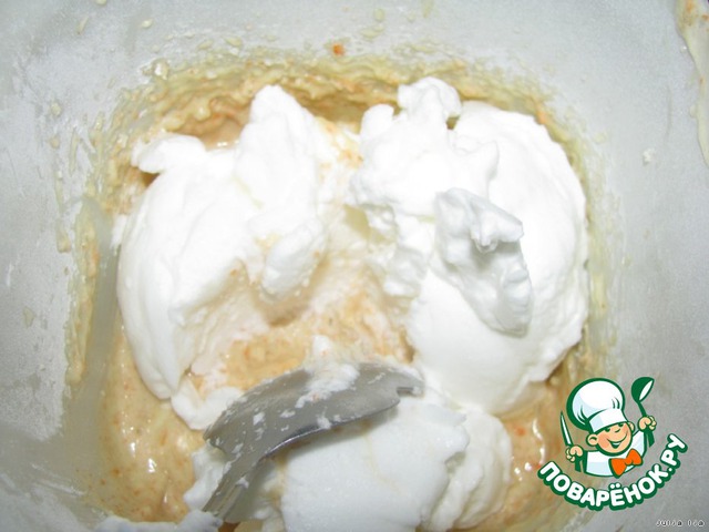 Белки взбить с щепоткой соли до очень крепкой пены. Выложить в тесто и перемешать в одном направлении ложкой (миксер здесь использовать нежелательно, так как тесто должно быть очень воздушным).