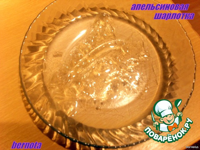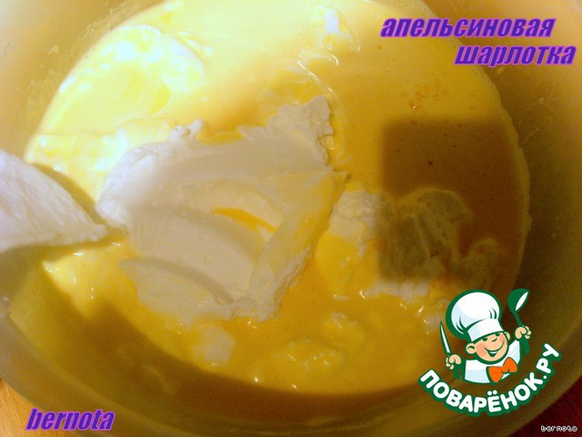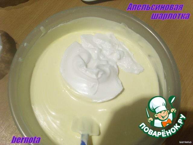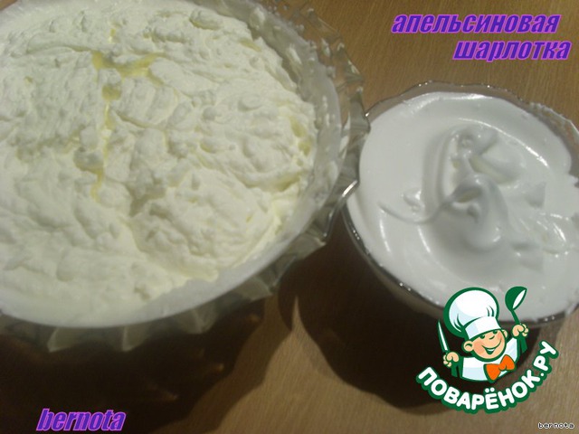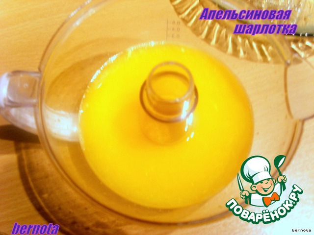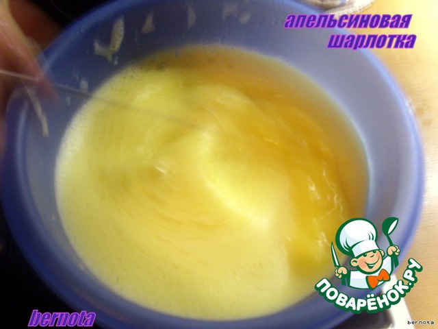 В чашку выливаем сок апельсина, добавляем 100 грамм сахара и 5 желтков и взбиваем до образования пены.