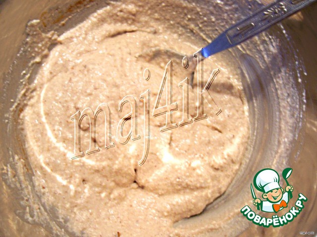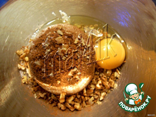 В мисочку выложить рикотту, 50 гр. сахара, ванильный сахар, корицу, порубленные грецкие орехи и 1 яйцо.