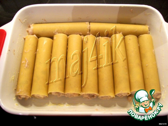 Начинённые каннеллони выложить в смазанную маслом форму.