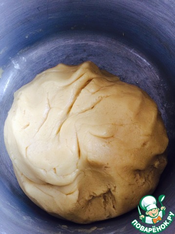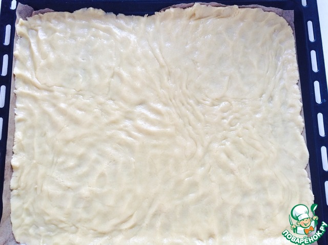 Делим тесто на три части. Одну часть положим в морозилку на 15 минут. Выкладываем на противень пекарскую бумагу (или просто смазываем противень маслом) и распределяем на нем оставшееся тесто.