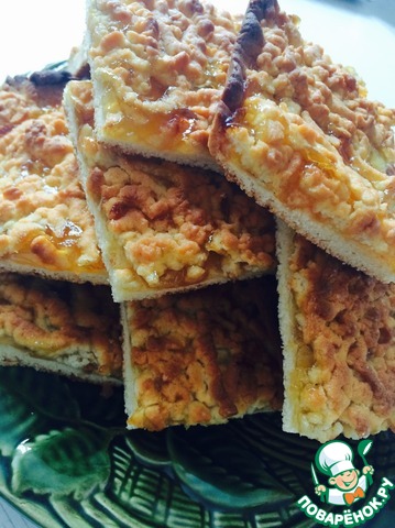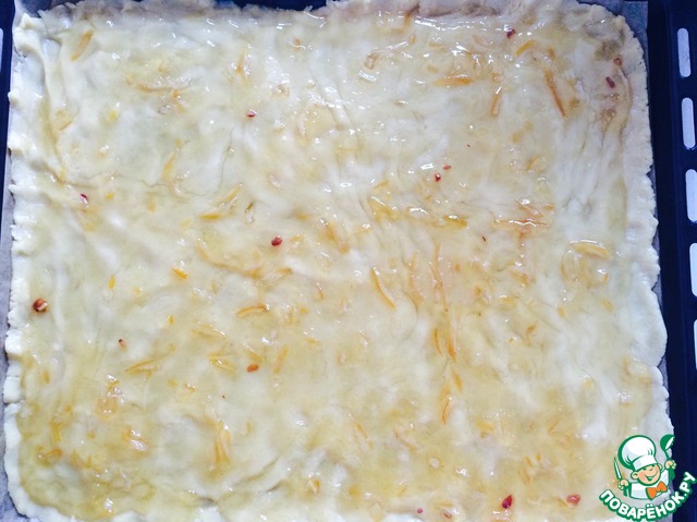 Поверх слоя теста выкладываем джем (у меня лимонный, он дает кислинку печенью, но сюда подойдет любой джем или варенье, перевёртыш ягоды и т. д. Если у вас жидкое варенье, то у нижнего слоя теста стоит подогнуть края, чтобы варенье не "сбежало".) выравниваем ложкой.