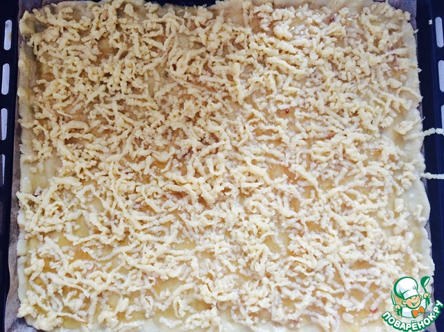 Достаем часть теста из морозилки, включаем разогреваться духовку, натираем тесто на крупной терке равномерно по всей поверхности противеня.