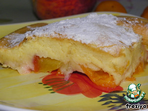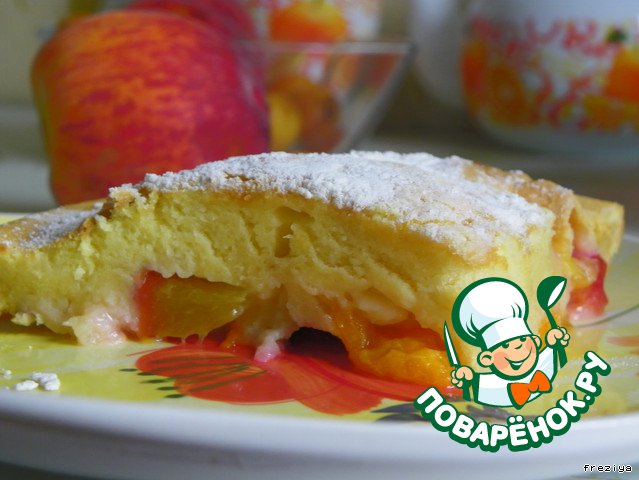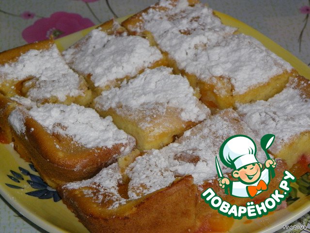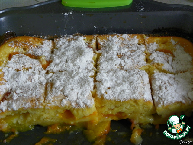 Получившийся пирог посыпаем сахарной пудры. И не жалеем, так как фрукты все же дают свою кислинку, для любителей сладкого рекомендую хорошо посыпать сахарной пудрой.