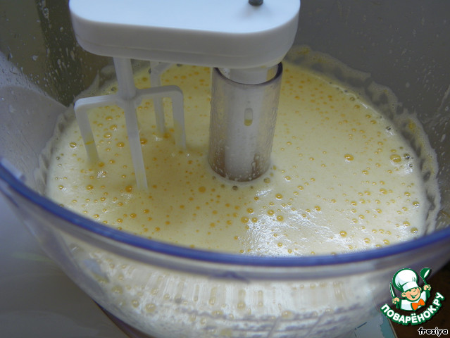 Яйца, ванильный и обычный сахар взбиваем вместе в пышную пену. Продолжая взбивать, вводим молоко, затем просеянную через сито муку и разрыхлитель.