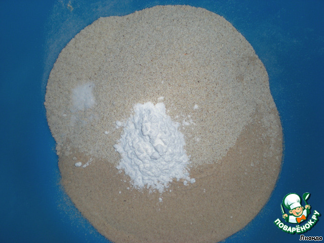 Смешать овсяную и гречневую муку, разрыхлитель и щепотку соли.