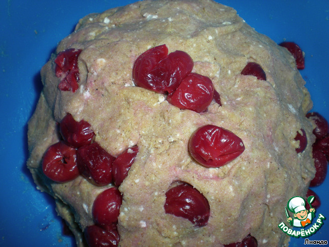 Соединить мучную и творожную смеси. Можно прямо в тесто добавить вишни. Но, как показала практика, лучше вишни добавлять в процессе формирования печенья – так удобнее.