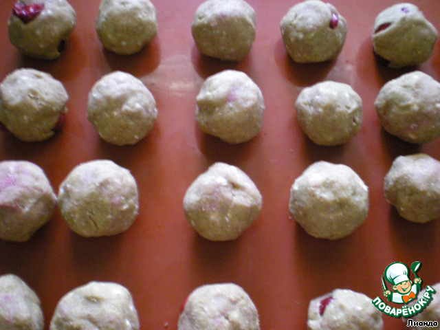 Скатайте шарики размером с грецкий орех. Если будете использовать вишни отдельно, то сформируйте лепешку, в середину положите вишню. А теперь сделайте шарик. У меня получилось 25 штук.
