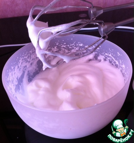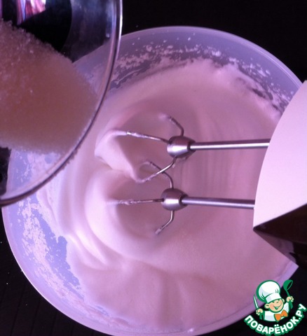 Затем тонкой струйкой всыпаем в них горячий сахар ( не карамелизируйте его!), взбивая на минимальной скорости. Он сразу растворяется, меренга готова.