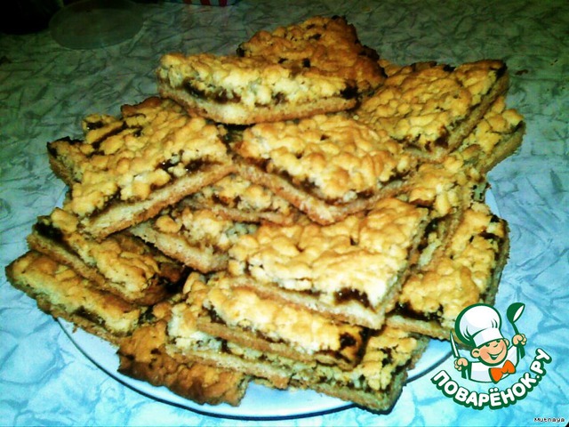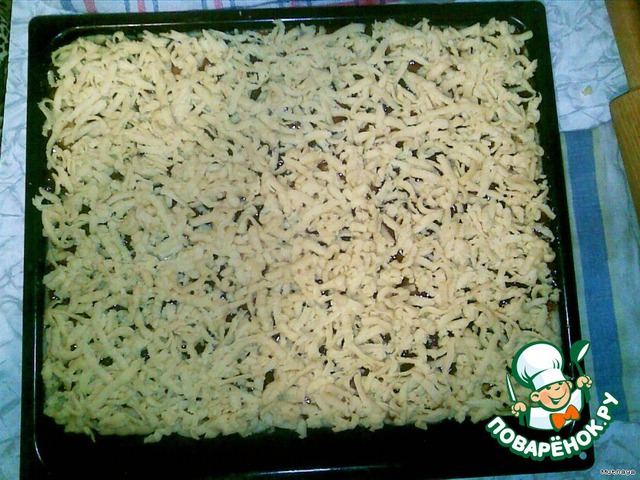 Вторую часть теста трем на крупной терке сверху на варенье, равномерно, чтоб закрыть весь пирог