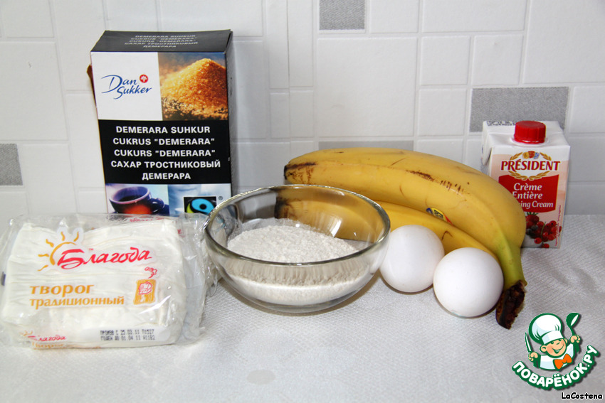 Наши продукты: творог, яйца, мука, коричневый сахар, бананы и сливки.