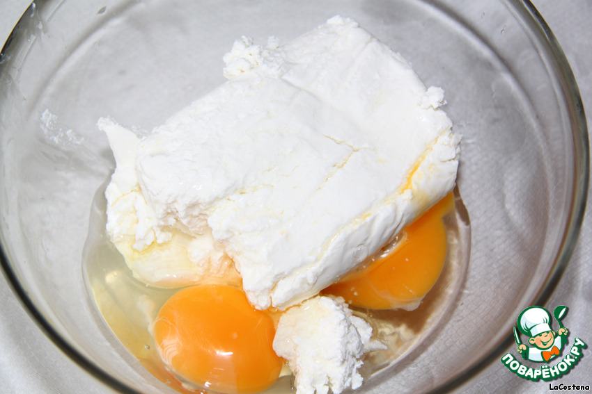 Добавим к творогу 2 яйца.