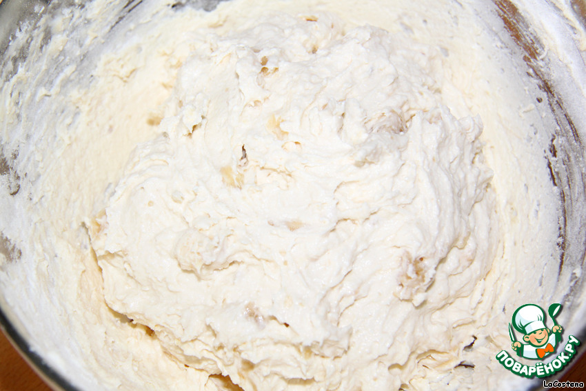 Добавим банан к творожной массе, перемешаем.