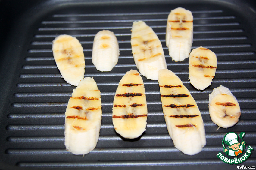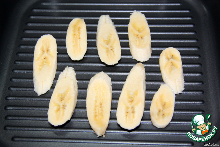 Сковороду-гриль нагреваем, выкладываем на нее кусочки банана.