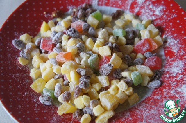 Нарезать кубиками марципан, добавить изюм и цукаты, обвалять их в муке.