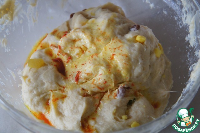 Добавить смесь в тесто, влить настой шафрана и вымесить.