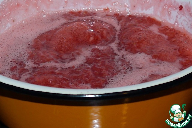 Берём промытую клубнику, варим с сахаром (100гр), +100мл. воды, в конце добавляем коньяк, даём закипеть, выключаем, остужаем, готовый джем измельчаем в блендере до пюре.