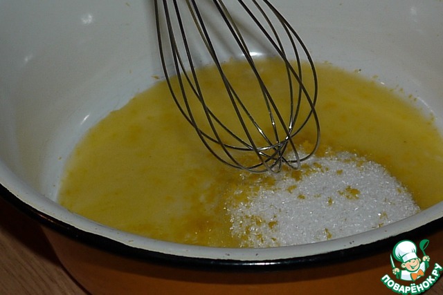 Взбить желтки с сахаром (50) и тёртой цедрой. и во взбитые желтки добавляем постепенно, по ложке Маскрапоне или Рикотта, продолжая взбивать.